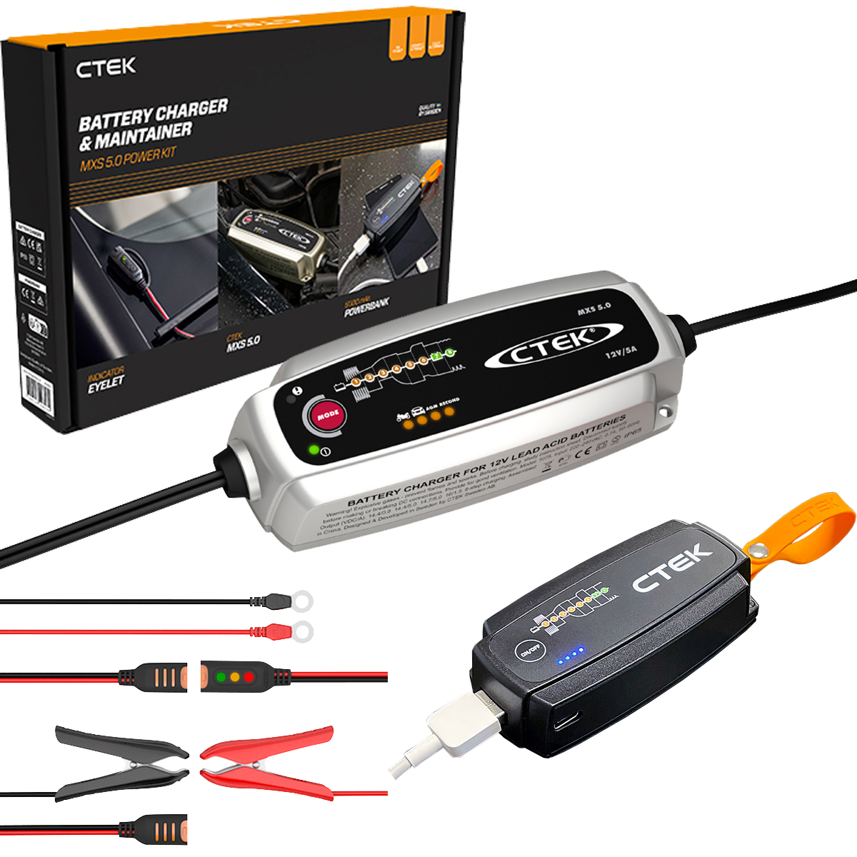 Das MXS 5.0 Batterieladegerät ist eines der weltweit fortschrittlichsten und zuverlässigsten 12V-Ladegeräte, das für schnelles, sicheres und vollautomatisches Laden und Warten entwickelt wurde. Mit Temperaturkompensation, Rekonditionierungsmodus und Unterstützung für AGM-Batterien sorgt es für optimale Leistung und verlängerte Batterielebensdauer bei Autos, Motorrädern und mehr. Das mitgelieferte INDICATOR EYELET M8 ermöglicht eine einfache Batterieüberwachung, während die CONNECT CLAMP für eine schnelle und sichere Verbindung sorgt. Und als Bonus enthält dieses Kit auch eine 5000-mAh-Powerbank von CTEK, damit Sie Ihre elektronischen Geräte immer und überall aufladen können.