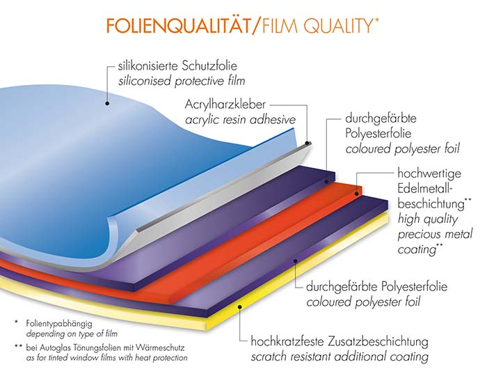 - 5 Jahre Materialgarantie gegen Ausbleichen, Verfärben, Rissbildung, Delaminierung, Nachlassen der Klebekraft und Demetallisierung - siehe Garantiebedingungen Autoglasfolie